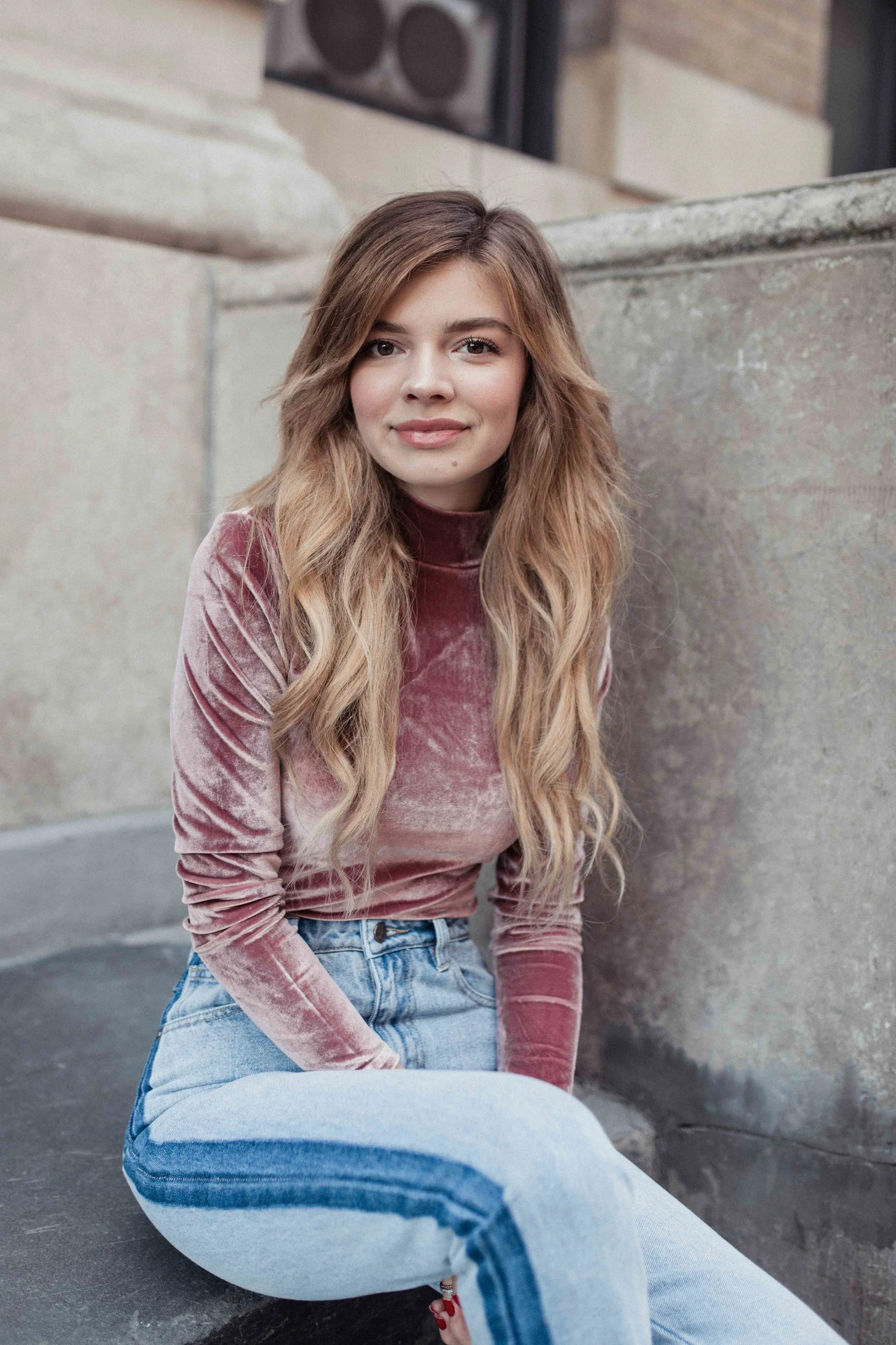 today's outfit is perfect for the mild fall we have been having here in manhattan! it's still warm enough to go without a jacket, but cool enough to get away with long sleeves. my pink velvet top is from princess polly, cool denim jeans is also mink pink from princess polly, and tennis shoes are nike court royal!